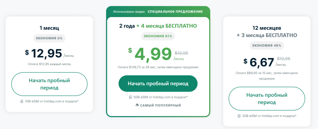 Есть три тарифа: на месяц, на 6 месяцев и на год. В первом случае вы должны отдать 12,95 долларов (доступно подключение до 8 устройств), во втором — 60 долларов, в третьем — 99,95 долларов. Минимум два раза в год есть скидки на все тарифы (акции приурочены к Рождеству и началу лета). Для оплаты нужно иметь карту иностранного банка или аккаунт в зарубежной платёжной системе.